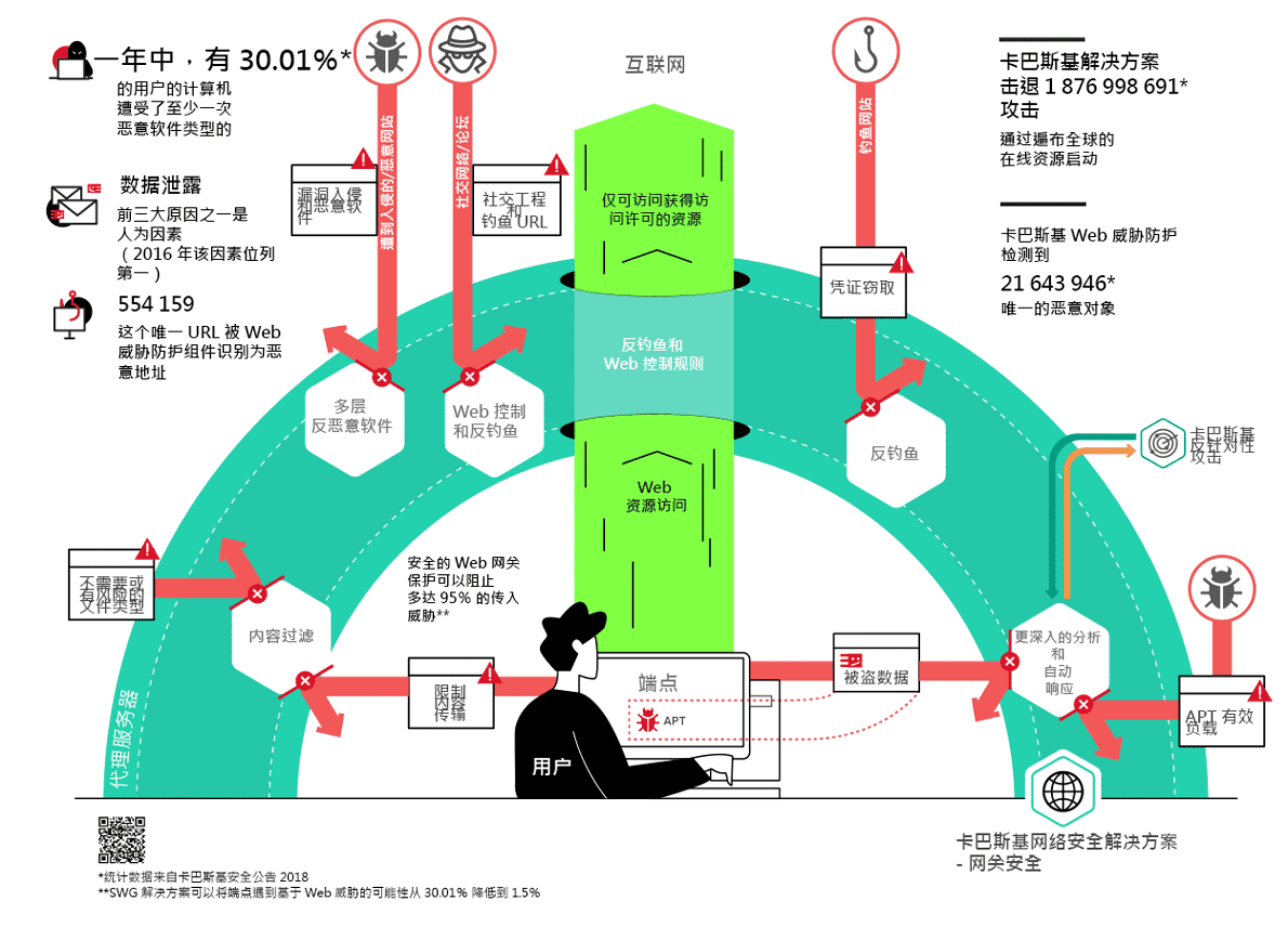 - 对于以下基于 web 的攻击,“卡巴斯基网络安全解决方案 - 网关安全”均可一网打尽:恶意软件下载、利用漏洞实施的偶然/水坑式攻击、仿造合法资源的钓鱼等。此外,该方案还能通过限制对特定网站资源和同类网站的访问以及特定类型文件的传输,来降低感染风险,减少数据泄露。